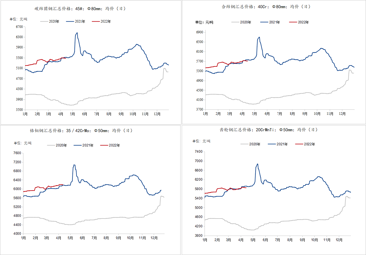 江蘇市場:本周江蘇優(yōu)特鋼價格較上周小幅回落。目前市場價格45#淮鋼5450元/噸,杭鋼5420元/噸,東方特鋼5420元/噸,40Cr淮鋼5690元/噸,20CrMnTi齒輪鋼萊鋼5790元/噸,35/42CrMo6090元/噸。鋼廠方面,江蘇優(yōu)特鋼廠棒材總庫存41.05萬噸,較上周增加4.35萬噸,環(huán)比增11.85%,較去年同期下降0.34萬噸,同比降0.82%。市場方面,本周江蘇物流受疫情影響依然嚴重,跨區(qū)域資源流通較少,廠庫和社庫庫存累庫速度較快,庫存增壓,下游需求表現(xiàn)較弱,預計下周江蘇優(yōu)特鋼市場價格弱勢盤整運行。