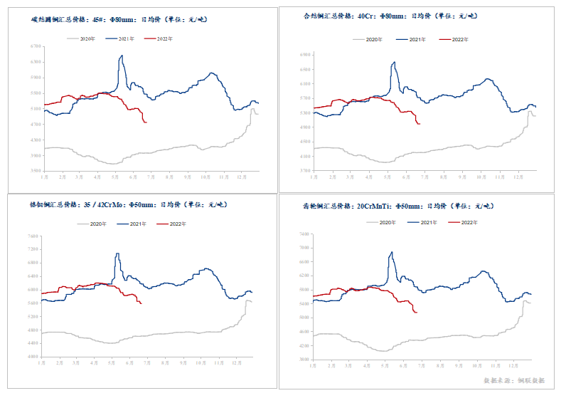 上周優(yōu)特鋼主流品種價(jià)格大幅下跌,其中45#鋼收4738元/噸,下跌240元/噸,40Cr收4979元/噸,下跌235元/噸,20CrMnTi收5138元/噸,下跌212元/噸,CrMo收5576元/噸,下跌184元/噸。
