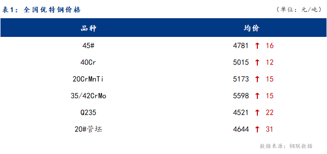 6月29日全國市場優(yōu)特鋼價格小幅上漲,45#碳結(jié)圓鋼Ф29-85全國均價報 4781元/噸,上漲16元/噸。主導(dǎo)市場杭州庫提4720元/噸,無錫庫提4740元/噸,山東直發(fā)4690元/噸。期貨盤面震蕩上行,市場成交尚可。