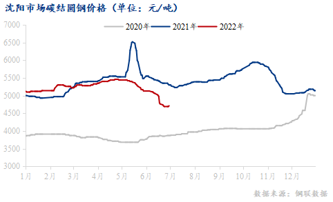 價(jià)格方面,我們可以看到2022年一季度價(jià)格窄幅震蕩,春節(jié)后價(jià)格小幅上漲,但后勁不足,受疫情影響,未能延續(xù)去年春節(jié)后持續(xù)上升的態(tài)勢(shì)。二季度價(jià)格從4月一開始的上漲趨勢(shì)直到本年度價(jià)格最高點(diǎn),開始逐漸回落直至六月大幅下跌至谷底。今年沈陽45#鋼價(jià)格最高點(diǎn)出現(xiàn)在4月中旬,報(bào)5460元/噸,最低點(diǎn)出現(xiàn)在6月下旬,報(bào)4650元/噸。今年最高點(diǎn)和去年最高點(diǎn)在5月中旬6520元/噸相差甚遠(yuǎn)。目前沈陽市場(chǎng)價(jià)格45#圓鋼本鋼4580元/噸(國(guó)標(biāo)),凌鋼4700元/噸,通鋼4690元/噸,建龍北滿4700元/噸。值得注意的是,今年3月19日沈陽大部分鋼材市場(chǎng)受疫情影響暫停營(yíng)業(yè),東北大部分市場(chǎng)休市,無法正常出貨,但3月價(jià)格仍呈上升態(tài)勢(shì),直到4月15日市場(chǎng)逐漸開市,恢復(fù)運(yùn)輸,價(jià)格也隨之來到本年度的高點(diǎn)。