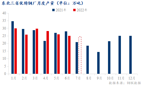 2022年上半年東北區(qū)域4家主要鋼廠樣本企業(yè)的實(shí)際產(chǎn)量在165.05萬噸左右,較去年同期減少了10.1萬噸,降幅5.94%。7月份預(yù)計(jì)產(chǎn)量24.5萬噸,環(huán)比減少0.6萬噸,同比增加3.5萬噸。目前本區(qū)域鋼廠基本保持正常生產(chǎn),個(gè)別鋼廠因利潤(rùn)縮減甚至虧損開始檢修減產(chǎn)。但現(xiàn)貨市場(chǎng)供應(yīng)仍較為充足。