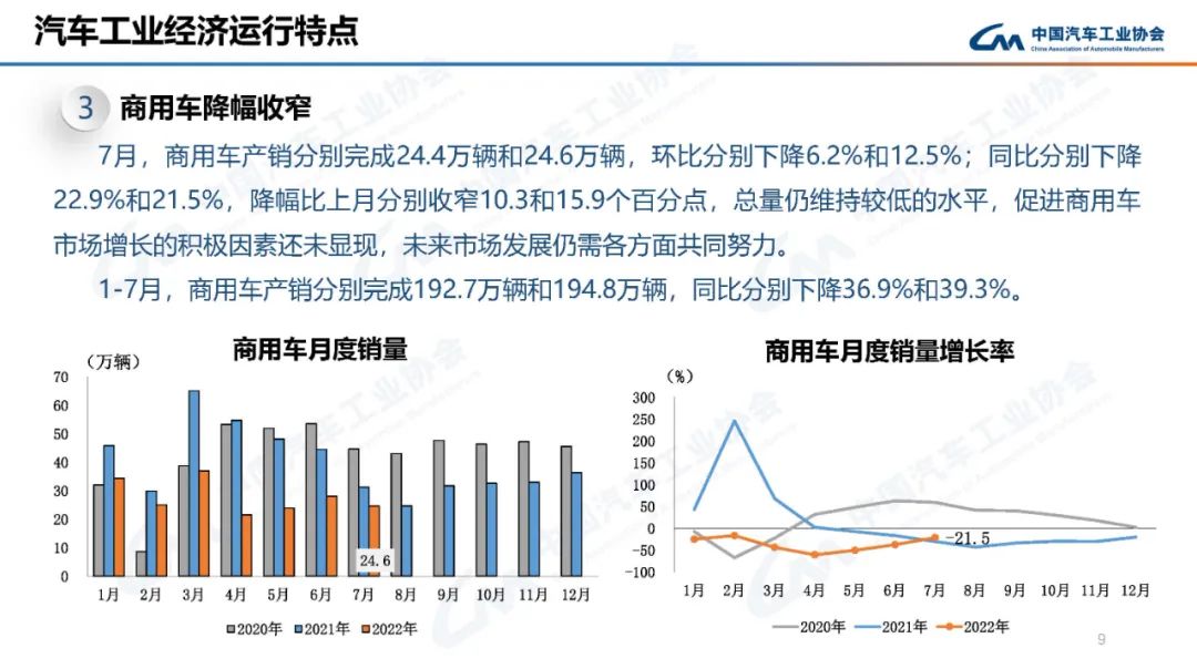 8月11日,中汽協(xié)數(shù)據(jù)顯示,7月,汽車產(chǎn)銷分別完成245.5萬輛和242萬輛,環(huán)比分別下降1.8%和3.3%,同比分別增長31.5%和29.7%。當(dāng)月產(chǎn)銷量雖然低于上月,但為歷年同期最高值,總體判斷目前行業(yè)發(fā)展的態(tài)勢良好,并有望繼續(xù)延續(xù)。1-7月,汽車產(chǎn)銷分別完成1457.1萬輛和1447.7萬輛,產(chǎn)量同比增長0.8%,銷量同比下降2%。上年8月份行業(yè)受芯片短缺影響嚴(yán)重,產(chǎn)銷量水平較低,因此今年1-8月有望實(shí)現(xiàn)產(chǎn)銷雙增長。