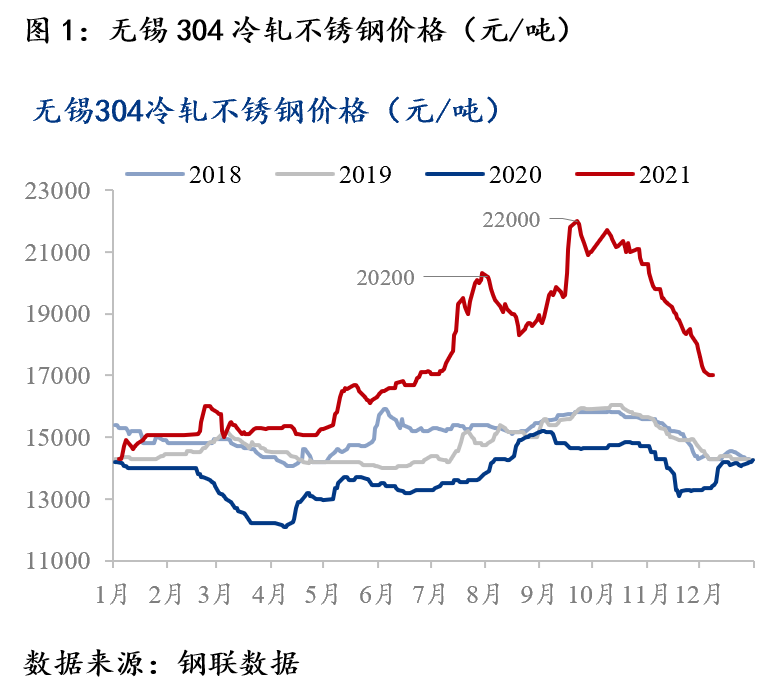 近期304冷軋不銹鋼價格瀑布式下跌,跌幅達5000元/噸。無錫304冷軋不銹鋼價格于9月22日達到年內(nèi)峰值22000元/噸,此后,304不銹鋼價格進入下跌通道。截止至12月7日,無錫304冷軋不銹鋼價格為17000元/噸,較9月末下跌5000元/噸,跌幅22.72%。