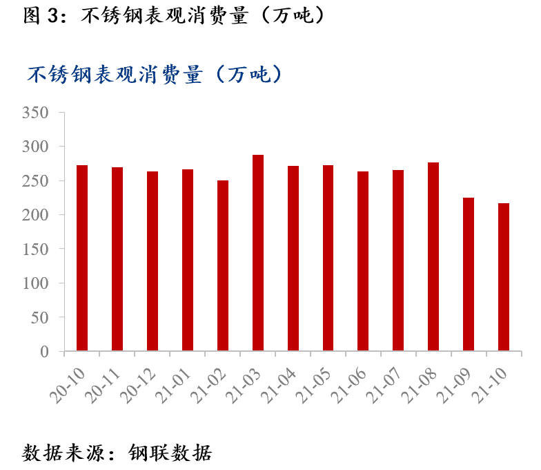 不銹鋼表觀消費量持續(xù)下滑。據(jù)測算,2021年9月開始不銹鋼表觀消費持續(xù)下滑,9月、10月表觀消費量較去年同期分別下滑16.45%及20.35%。9、10月表觀消費的下滑一方面是因為華東、華南地區(qū)有序用電,制造業(yè)企業(yè)生產(chǎn)受限,對不銹鋼需求下降。另一方面是因為前期不銹鋼價格持續(xù)上漲,下游企業(yè)僅少量按需采購,持續(xù)維持低庫存狀態(tài)。整體消費的低迷拖累不銹鋼價格。