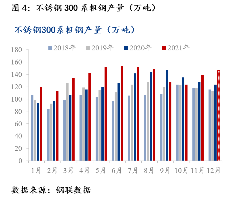 限電影響減退,不銹鋼產(chǎn)量明顯回升。2021年上半年不銹鋼主要生產(chǎn)地區(qū)廣西、廣東、福建、江蘇能耗雙控上半年能耗強度不降反升,為一級預(yù)警。9月、10月在限電限產(chǎn)的影響下,不銹鋼產(chǎn)量大幅減產(chǎn)。11月限電影響減退,不銹鋼粗鋼產(chǎn)量出現(xiàn)明顯回升。據(jù)Mysteel調(diào)研,11月國內(nèi)32家不銹鋼廠300系粗鋼產(chǎn)量為138.81萬噸,環(huán)比增加12.35%,其中福建、廣西、廣東等主產(chǎn)地區(qū)產(chǎn)量均環(huán)比10月增加。