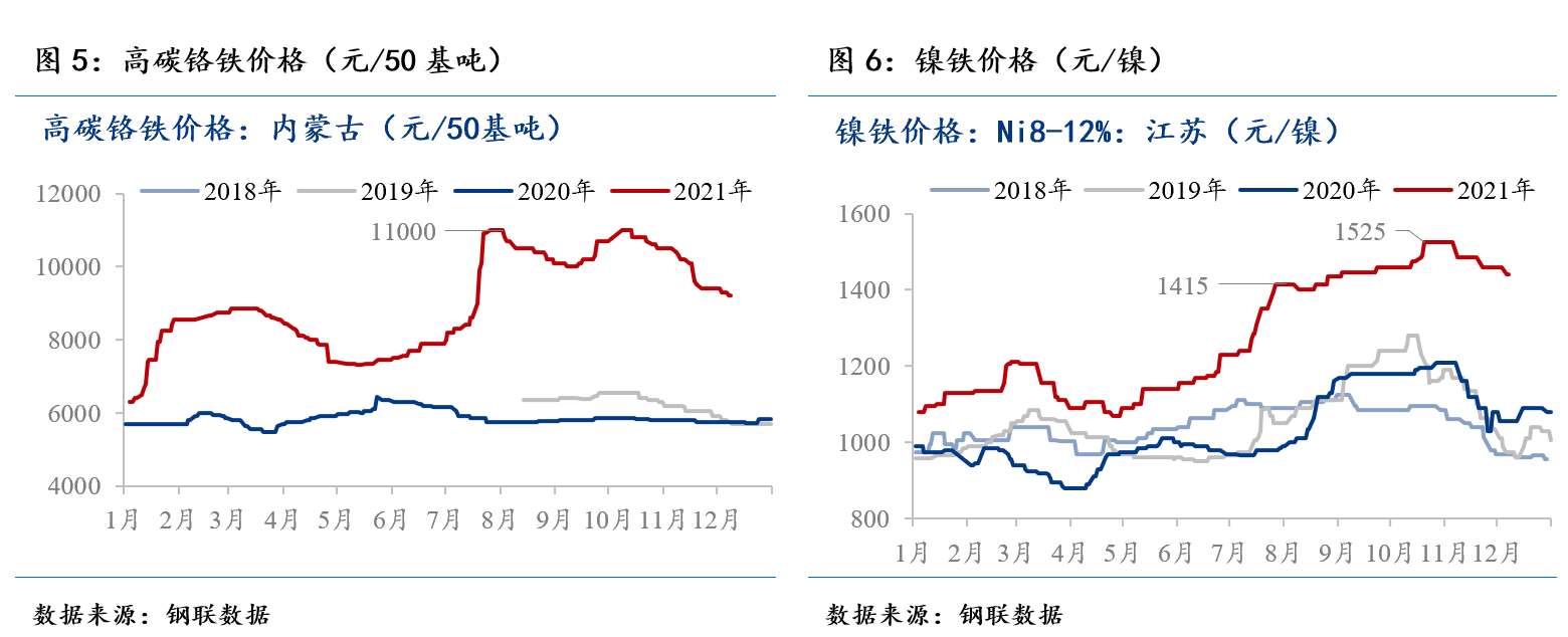鉻鐵方面,9月至10月中旬,因供給存在缺口,高碳鉻鐵價格持續(xù)上漲,達到11000元/50基噸。內(nèi)蒙古9月末發(fā)布提高保底電價的意見征集稿,廣西、江蘇、陜西榆林受能耗雙控影響;四川、貴州分別受環(huán)保督查以及拉閘限電的影響,供給持續(xù)緊缺。10中下旬至11月,因電力緊張緩解,全國鉻鐵廠接近滿負(fù)荷生產(chǎn),且部分新項目集中投產(chǎn),高碳鉻鐵產(chǎn)量明顯增加。據(jù)Mysteel調(diào)研,11月高碳鉻鐵產(chǎn)量為64.34萬噸,環(huán)比增加40.2%,全國鉻鐵產(chǎn)量創(chuàng)歷史新高,價格逐漸回落。截至12月7日,高碳鉻鐵價格跌至9200元/50基噸,較10月中旬高位下跌16.36%。