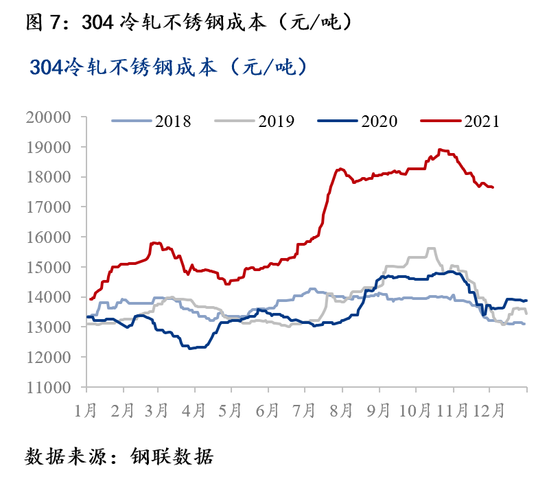 原料價格下行,成本支撐轉(zhuǎn)弱。300系主要原料中高鎳鐵及高碳鉻鐵價格于10月中下旬左右開始下行,使不銹鋼成本重心下移。截至12月3日,304不銹鋼成本較10月末下移1100元/噸,降幅接近6%,同期成材價格降幅15%。