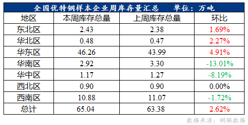 全國(guó)優(yōu)特鋼棒材樣本總庫(kù)存65.04萬(wàn)噸,環(huán)比上升1.66萬(wàn)噸,增幅2.62%。