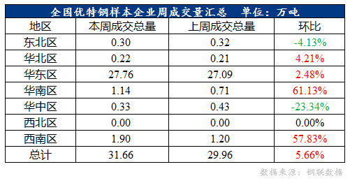 全國(guó)優(yōu)特鋼棒材樣本企業(yè)成交量31.66萬(wàn)噸,環(huán)比上升1.7萬(wàn)噸,增幅5.66%。