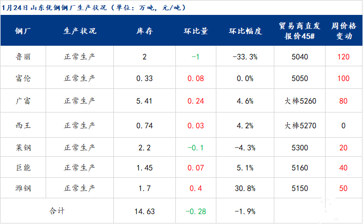 1月24日山東優(yōu)特鋼廠棒材總庫存14.63萬噸,環(huán)比減少0.28萬噸,降幅1.88%,較去年同期減少3.71萬噸,降幅20.23%。