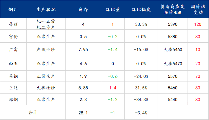 山東優(yōu)特鋼廠庫(kù)存28.1萬(wàn)噸,環(huán)比下降1萬(wàn)噸,下降3.4%,同比增加5.12萬(wàn)噸,增幅22.28%。生產(chǎn)方面,巨能大棒檢修,魯麗二軋檢修,廣富圓鋼產(chǎn)線檢修,江鑫停產(chǎn),其他鋼廠生產(chǎn)暫時(shí)正常。