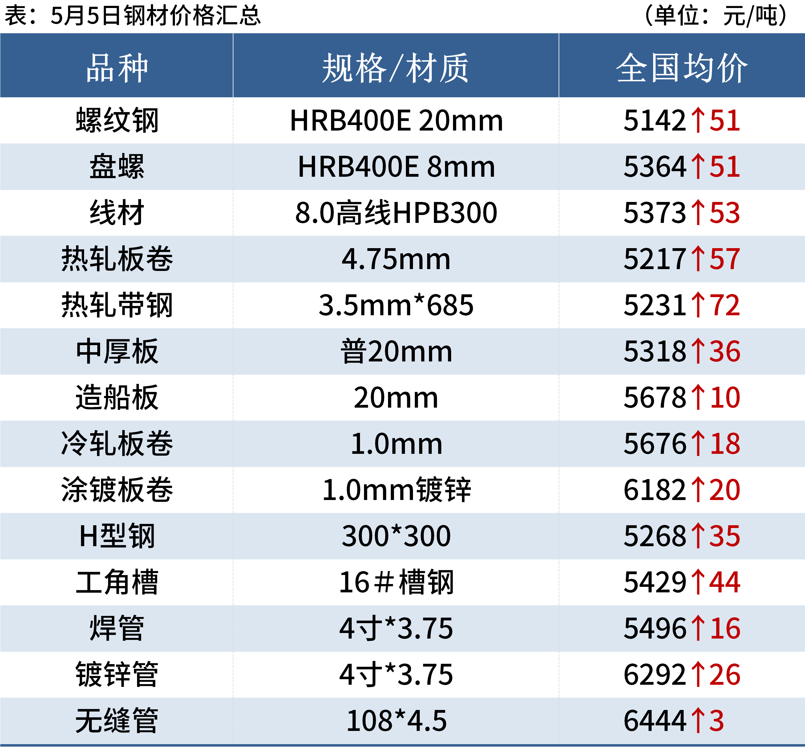 熱軋板卷:5月5日,全國24個(gè)主要城市4.75mm熱軋板卷均價(jià)5217元/噸,較上個(gè)交易日上漲57元/噸。節(jié)中因物流恢復(fù)情況一般,市場到貨不多,累庫低于往年同期,周環(huán)比增加6.25萬噸,節(jié)中鋼廠供給變動(dòng)不大,周環(huán)比增加0.08萬噸,廠庫也小幅增加1.65萬噸。節(jié)后市場預(yù)期疫情逐步向好發(fā)展,復(fù)工復(fù)產(chǎn)企業(yè)增加,打通上下產(chǎn)業(yè)鏈,短期市場補(bǔ)庫需求明顯。前期現(xiàn)實(shí)需求受疫情干擾偏弱,去庫不及預(yù)期,但在財(cái)政和貨幣寬松下以及疫情解封后,需求延遲釋放的確定性大,綜合來看,預(yù)計(jì)熱卷現(xiàn)貨市場價(jià)格短期維持高位震蕩運(yùn)行。