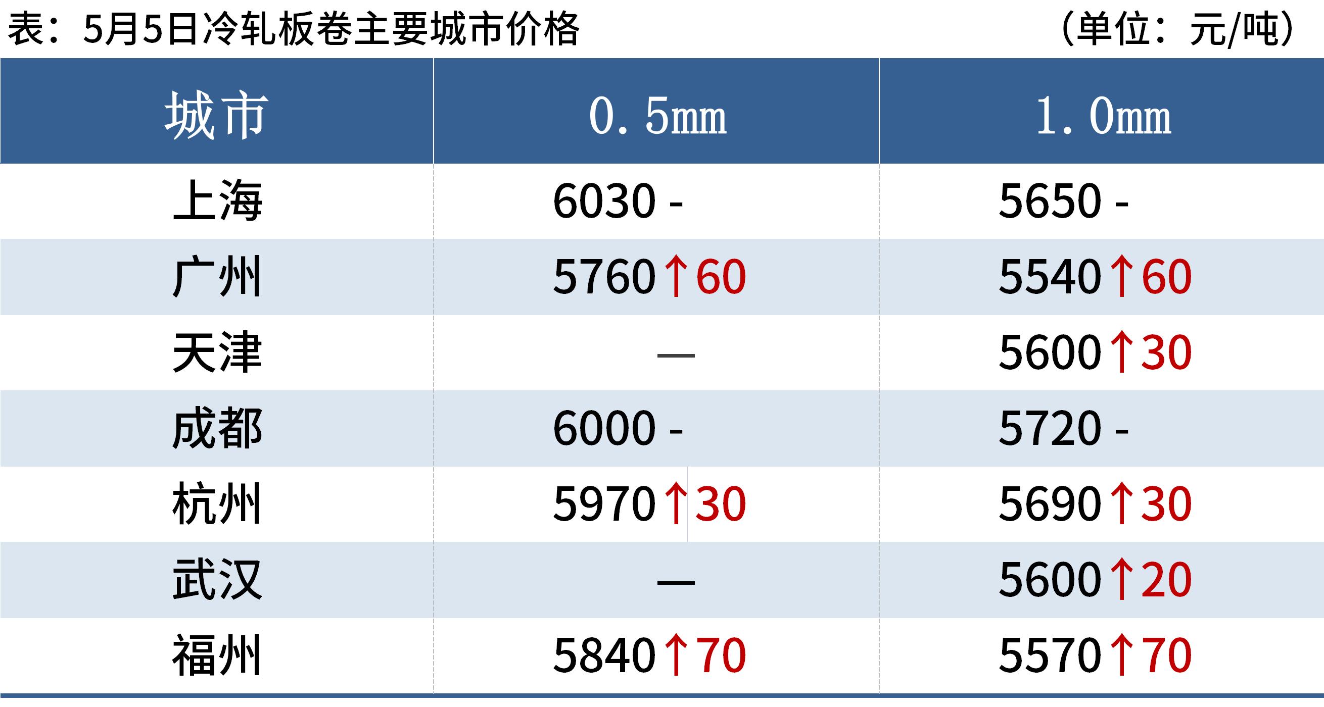 冷軋板卷:5月5日,全國24個(gè)主要城市1.0mm冷卷均價(jià)5676元/噸,較上個(gè)交易日上漲18元/噸。據(jù)部分貿(mào)易商反饋,假期過后市場上存在部分補(bǔ)庫現(xiàn)象,現(xiàn)貨市場交投氛圍較為活躍,再加上期貨盤面整體偏強(qiáng)運(yùn)行,今日整體成交表現(xiàn)較好。鋼廠方面,據(jù)悉,部分鋼廠預(yù)計(jì)本月檢修,計(jì)劃檢修時(shí)間6-10天。庫存方面,據(jù)Mysteel不完全統(tǒng)計(jì),現(xiàn)冷軋鋼廠庫存44.13萬噸,周環(huán)比增加0.53萬噸,社會(huì)庫存139.41萬噸,周環(huán)比增加4.36萬噸,周消費(fèi)量83.31萬噸,環(huán)比減少1.33萬噸。綜合來看,故預(yù)計(jì)6日國內(nèi)冷軋板卷價(jià)格或?qū)⒄鹗庍\(yùn)行。