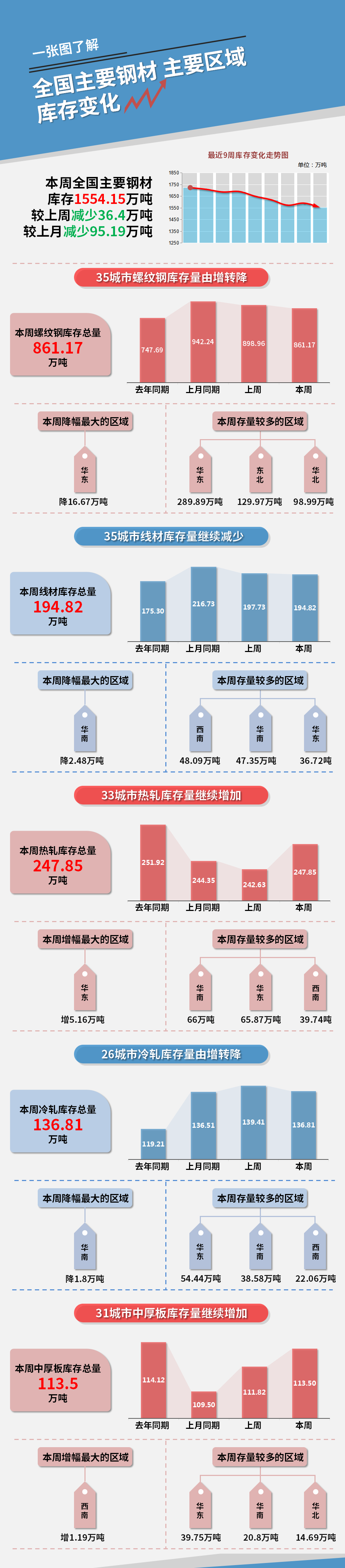 全國主要鋼材社會庫存1554.15萬噸,較上一期減少36.40萬噸,較上月同期減少95.19萬噸;螺紋鋼庫存861.17萬噸,較上一期減少37.79萬噸。