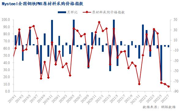 7月份原材料采購(gòu)價(jià)格指數(shù)6.7,環(huán)比下降3.4個(gè)百分點(diǎn),為近五年最低點(diǎn),表明鋼廠(chǎng)生產(chǎn)積極性持續(xù)下滑,備貨意愿不足。截止7月29日,Mysteel數(shù)據(jù)顯示,Myipic綜合指數(shù)為113.99,環(huán)比上月下降9.32%,同比去年下跌44.77%。其中進(jìn)口礦同比下跌42.78%,國(guó)產(chǎn)礦同比下跌47.97%。
