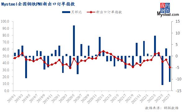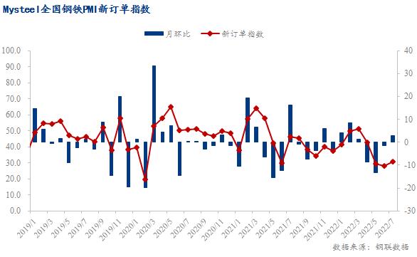 2022年7月份全國(guó)鋼鐵行業(yè)PMI為34.5%,環(huán)比回落2.7個(gè)百分點(diǎn),創(chuàng)下自2020年3月份以來(lái)新低。分指標(biāo)來(lái)看,本月各分項(xiàng)指數(shù)全線(xiàn)低于榮枯線(xiàn)下方,其中產(chǎn)出指數(shù)也降至近3年低點(diǎn),新訂單指數(shù)略有回升,但新出口訂單指數(shù)明顯下滑,顯示7月份國(guó)內(nèi)鋼鐵行業(yè)在供需疲弱中逐步改善。具體來(lái)看,7月份國(guó)內(nèi)鋼材價(jià)格呈現(xiàn)超跌后反彈態(tài)勢(shì)運(yùn)行,首先受美聯(lián)儲(chǔ)加息以及需求下降的悲觀(guān)預(yù)期打壓,國(guó)內(nèi)鋼材價(jià)格大幅回落,尤其在中旬市場(chǎng)情緒一致性極度悲觀(guān),導(dǎo)致現(xiàn)貨價(jià)格深度回調(diào),創(chuàng)下近2年來(lái)低點(diǎn)。不過(guò)隨著情緒的釋放以及投機(jī)需求逐步入場(chǎng),后半月市場(chǎng)價(jià)格迎來(lái)震蕩反彈。面對(duì)即將到來(lái)的8月份,國(guó)內(nèi)鋼價(jià)能否繼續(xù)反彈,行業(yè)基本面能夠迎來(lái)好轉(zhuǎn),下面筆者從PMI各項(xiàng)指數(shù)進(jìn)行分析解讀。