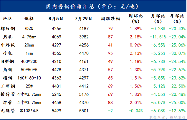 5日國內(nèi)主要品種價格除個別管材外,均呈上漲態(tài)勢。主要品種中,螺紋鋼均價報收4266元/噸,周環(huán)比上漲79元/噸;熱軋板卷均價報收4069元/噸,周環(huán)比上漲87元/噸;中厚板均價報收4297元/噸,周環(huán)比上漲41元/噸;冷軋板卷均價報收4565元/噸,周環(huán)比上漲95元/噸。