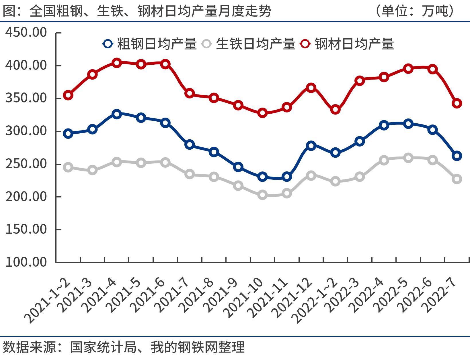 7月份全國粗鋼日均產(chǎn)量262.68萬噸,環(huán)比大幅下降13.2%。進入高溫需求淡季,加上樓市繼續(xù)探底,7月份鋼材需求疲弱,庫存去化緩慢,鋼價弱勢下行。隨著鋼廠普遍出現(xiàn)虧損,持續(xù)擴大檢修減產(chǎn)范圍。