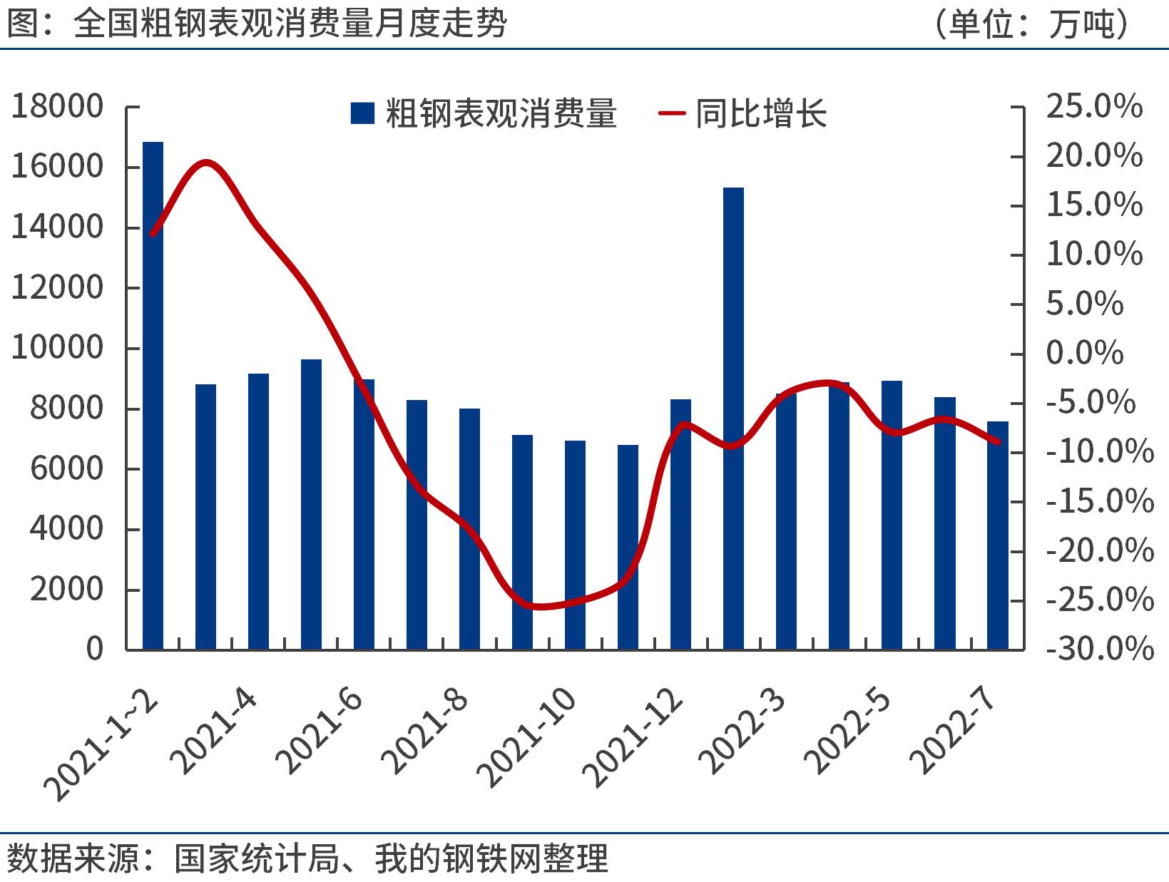 二、1-7月份全國粗鋼表觀消費量5.78億噸,同比下降7.0%