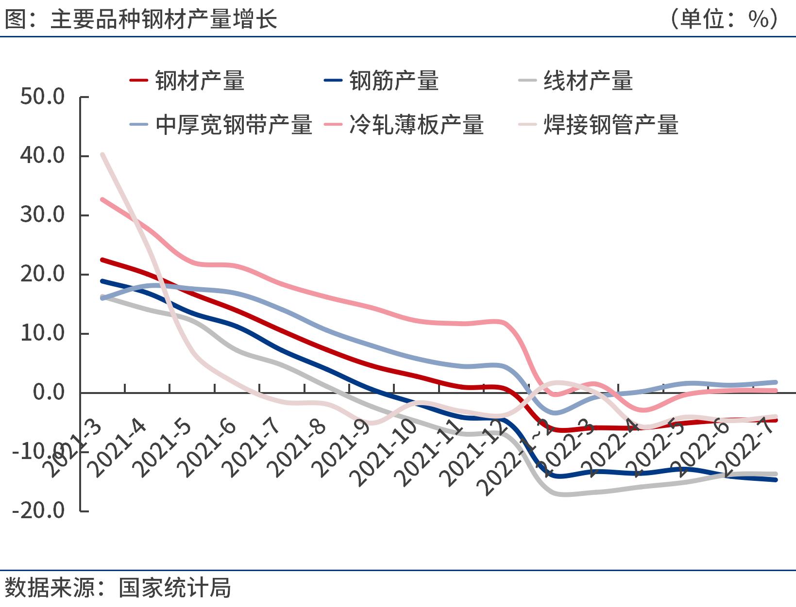 按鋼材品種來看,2022年1-7月份,我國鋼材產(chǎn)量7.77億噸,同比下降4.6%。其中,鋼筋產(chǎn)量1.36億噸,同比下降14.7%;線材產(chǎn)量8332.0萬噸,同比下降13.7%;冷軋薄板產(chǎn)量2505.7萬噸,同比增長0.4%;中厚寬鋼帶產(chǎn)量11123.1萬噸,同比增長1.8%;焊接鋼管產(chǎn)量3340.3萬噸,同比下降4.0%。
