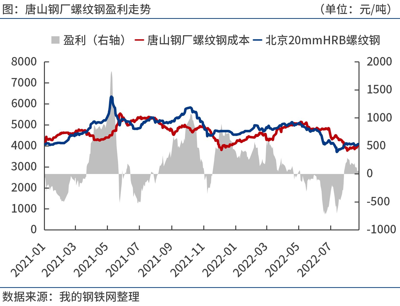 2022年7月份,鋼筋、線材、中厚寬鋼帶、冷軋薄板、焊接鋼等日均產(chǎn)量為55.2萬噸、37.3萬噸、49.1萬噸、11.6萬噸和16.7萬噸,分別較上月減少11.6萬噸、6.2萬噸、7.4萬噸、1.0萬噸和0.9萬噸。8月份鋼廠效益有所好轉(zhuǎn),建筑鋼材日產(chǎn)或低位回升,板材日產(chǎn)或繼續(xù)低位運行。