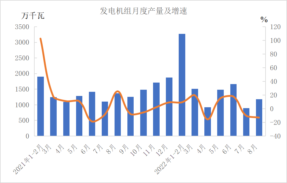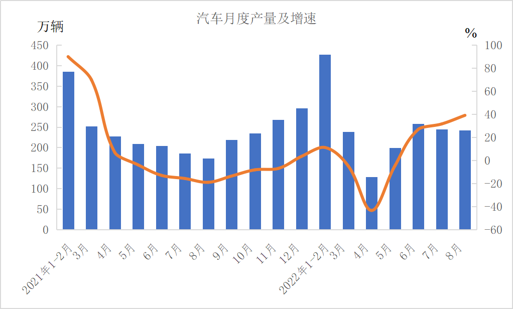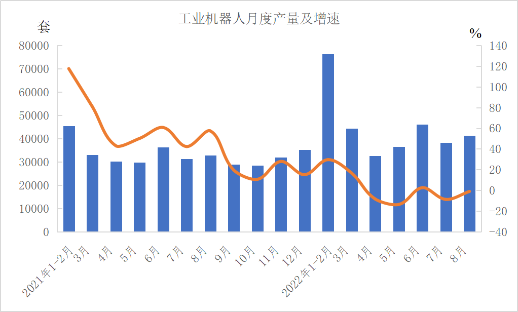 分產(chǎn)品看,1-8月份,金屬切削機床38萬臺,下降10.5%;工業(yè)機器人277536套,下降10.5%;汽車1735.8萬輛,增長6.1%,其中新能源汽車407.4萬輛,增長110.1%;發(fā)電機組(發(fā)電設(shè)備)9602萬千瓦,增長2.8%。