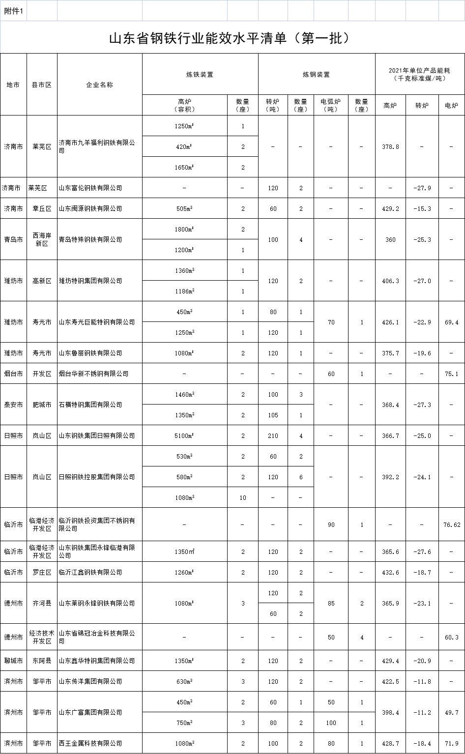 - 山東鋼鐵行業(yè)能效水平(第一批)公告